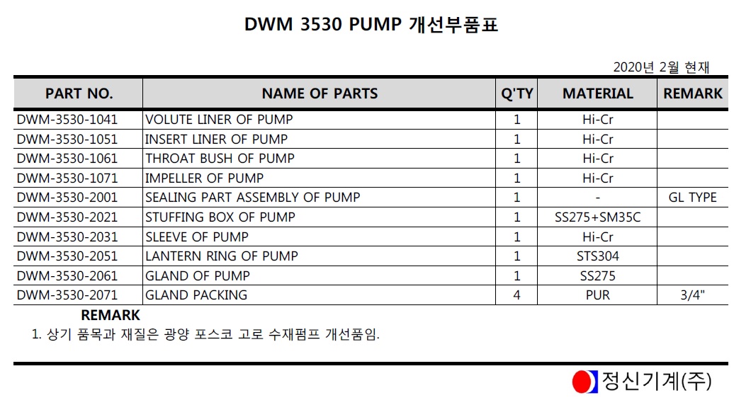 DWM 3530 PUMP 개선부품표